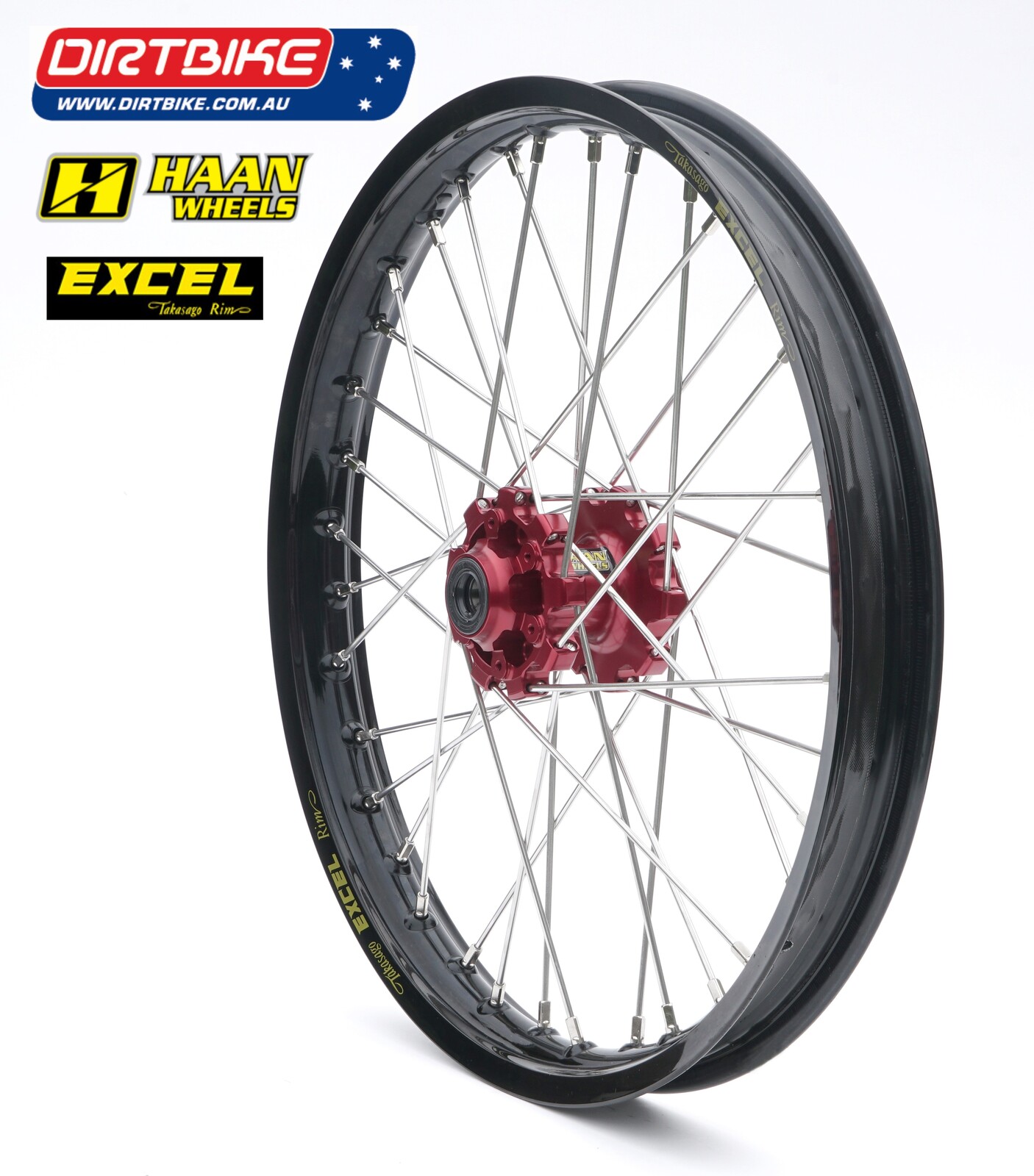 Ok so what is the Haan Factory Rally Wheel Set. This wheel set is quite simply the strongest combo possible for serious Offroad use. Perfect for the purpose of building a Rally bike from a enduro Single cylinder range so as to simply have a great lightweight Adventure Bike. Ideal for protecting the Hard facing on the gearbox and smoothing out the ride. For the Twin Cylinder owners the Rally Spec Wheel sets are generally narrower than OEM and standard up to offroad use far superior to OEM. We start with a HAAN cush drive rear hub and then lace that to the Excel Takasako Rim with the best spokes made from Haan. Sounds simple but why buy them from Dirtbike Pty Ltd.