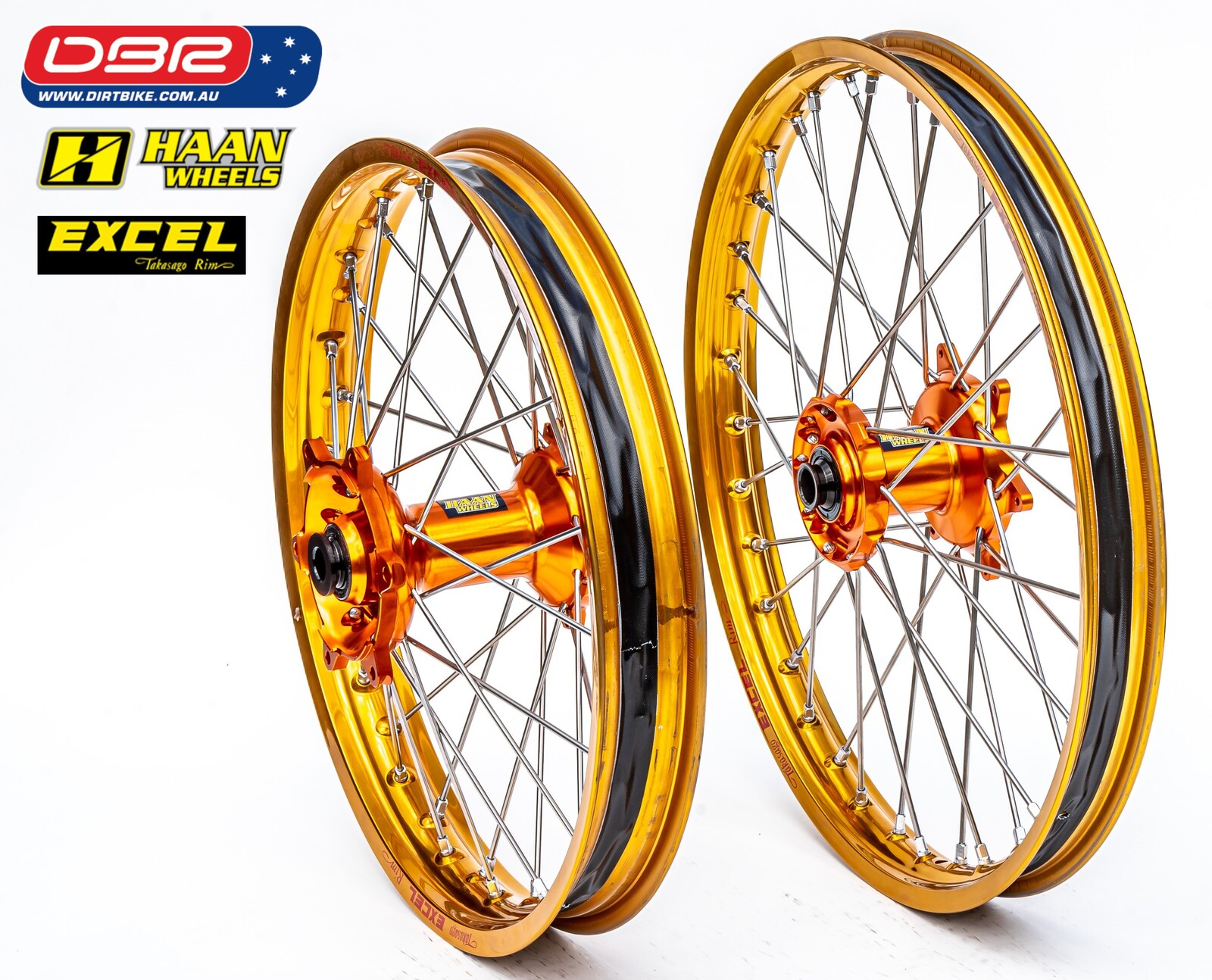 Ok so what is the Haan Factory Rally Wheel Set. This wheel set is quite simply the strongest combo possible for serious Offroad use. Perfect for the purpose of building a Rally bike from a enduro Single cylinder range so as to simply have a great lightweight Adventure Bike. Ideal for protecting the Hard facing on the gearbox and smoothing out the ride. For the Twin Cylinder owners the Rally Spec Wheel sets are generally narrower than OEM and standard up to offroad use far superior to OEM. We start with a HAAN cush drive rear hub and then lace that to the Excel Takasako Rim with the best spokes made from Haan. Sounds simple but why buy them from Dirtbike Pty Ltd.