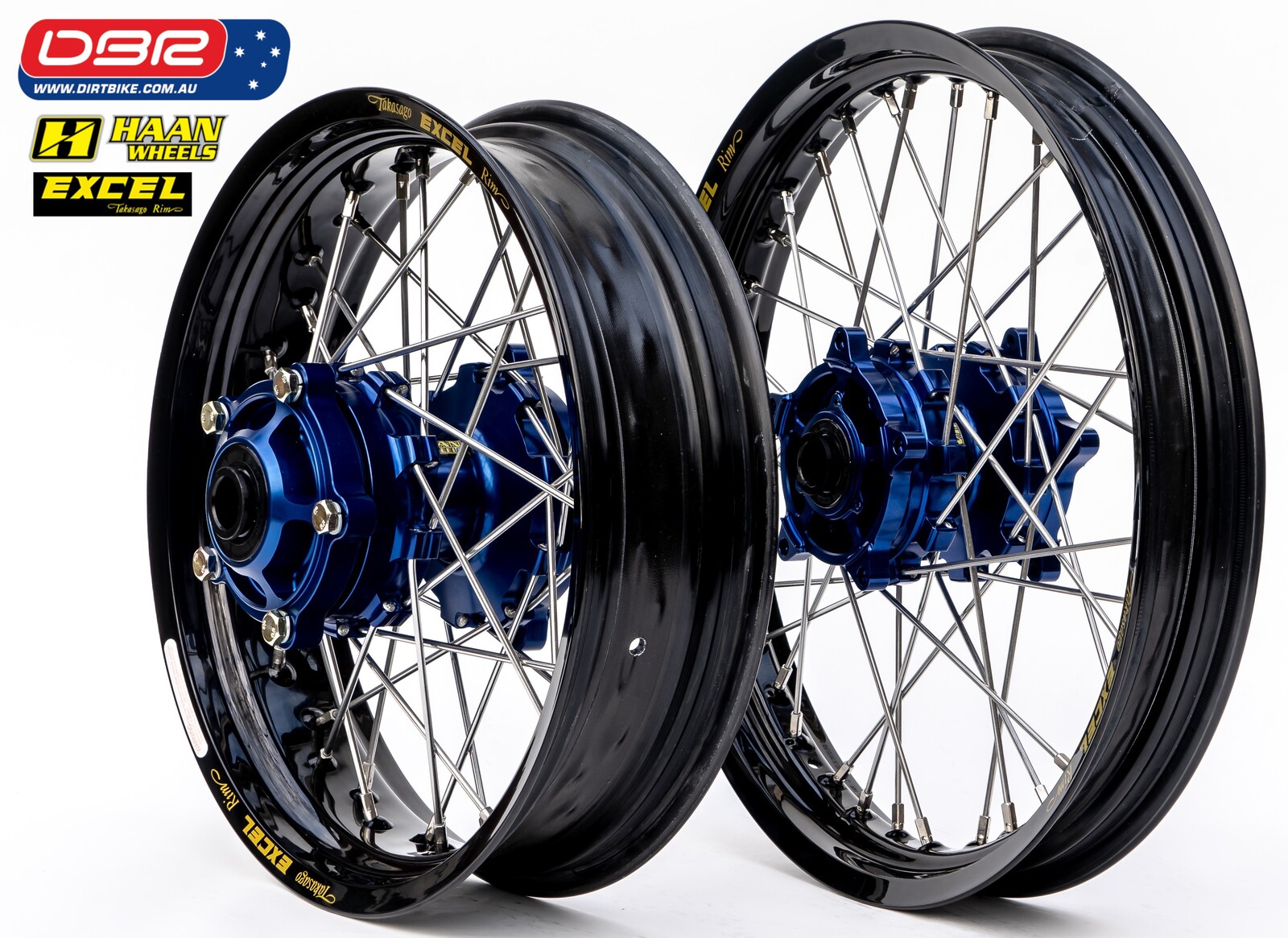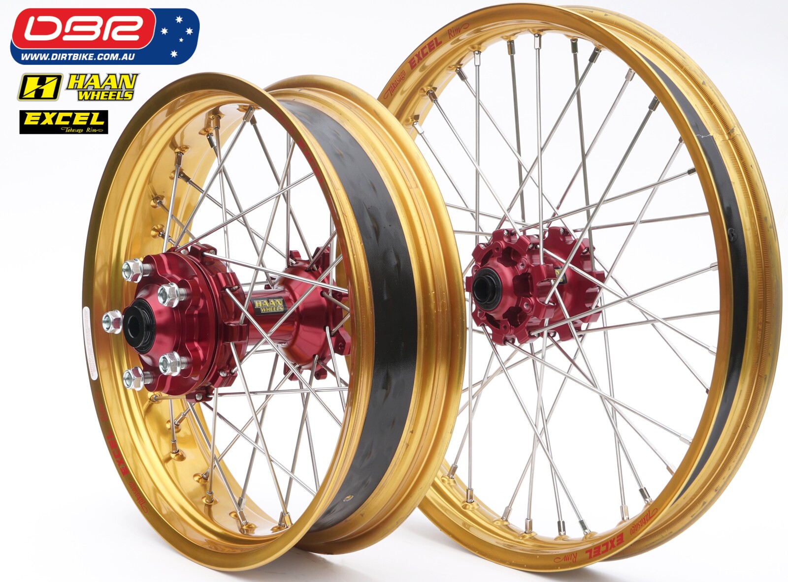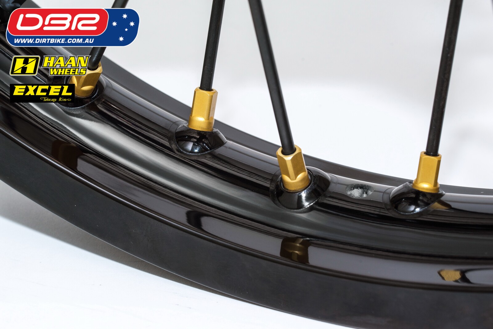 Ok so what is the Haan Factory Rally Wheel Set. This wheel set is quite simply the strongest combo possible for serious Offroad use. Perfect for the purpose of building a Rally bike from a enduro Single cylinder range so as to simply have a great lightweight Adventure Bike. Ideal for protecting the Hard facing on the gearbox and smoothing out the ride. For the Twin Cylinder owners the Rally Spec Wheel sets are generally narrower than OEM and standard up to offroad use far superior to OEM. We start with a HAAN cush drive rear hub and then lace that to the Excel Takasako Rim with the best spokes made from Haan. Sounds simple but why buy them from Dirtbike Pty Ltd.