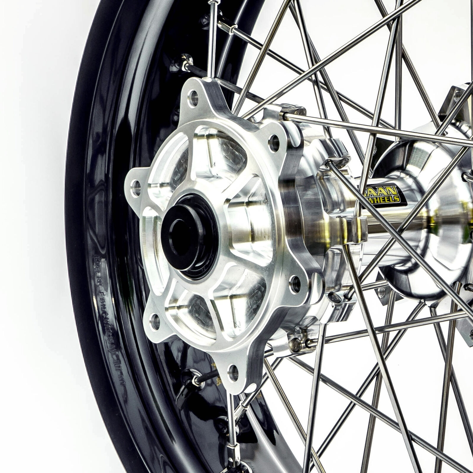 Ok so what is the Haan Factory Rally Wheel Set. This wheel set is quite simply the strongest combo possible for serious Offroad use. Perfect for the purpose of building a Rally bike from a enduro Single cylinder range so as to simply have a great lightweight Adventure Bike. Ideal for protecting the Hard facing on the gearbox and smoothing out the ride. For the Twin Cylinder owners the Rally Spec Wheel sets are generally narrower than OEM and standard up to offroad use far superior to OEM. We start with a HAAN cush drive rear hub and then lace that to the Excel Takasako Rim with the best spokes made from Haan. Sounds simple but why buy them from Dirtbike Pty Ltd.