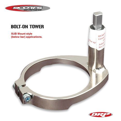 This tower is a SUB Mount style bolt-on tower designed for below the handlebar stabilizer mounting. The bolt on tower is designed to clamp around the top of the head tube.